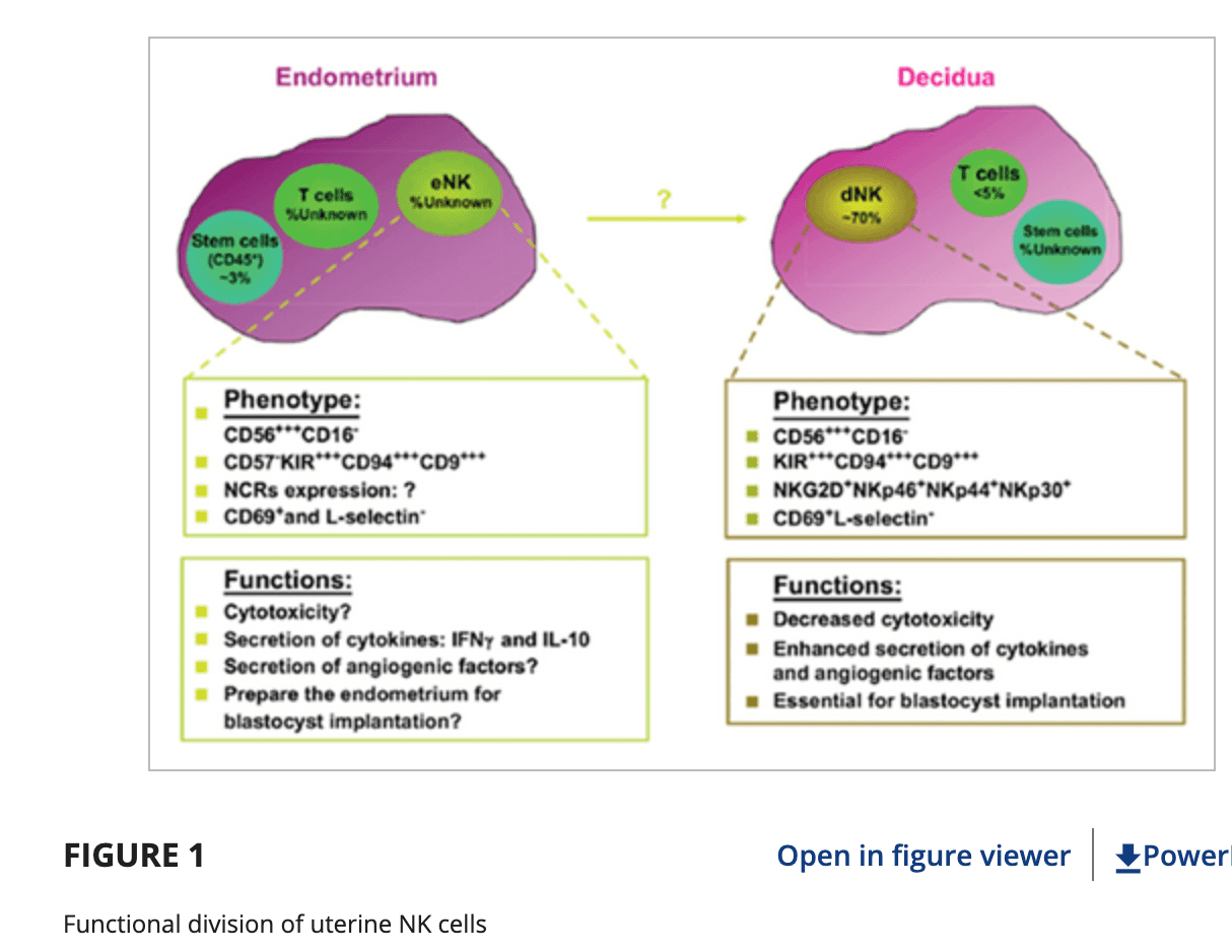 Figure 1. Differences in endometrial and decidual NK cell populations. eNKs are comparatively cytotoxic, while dNKs are intentionally non-toxic and produce anti-inflammatory cytokines to preserve the maternal-fetal interface (Rao et. al, 2022).