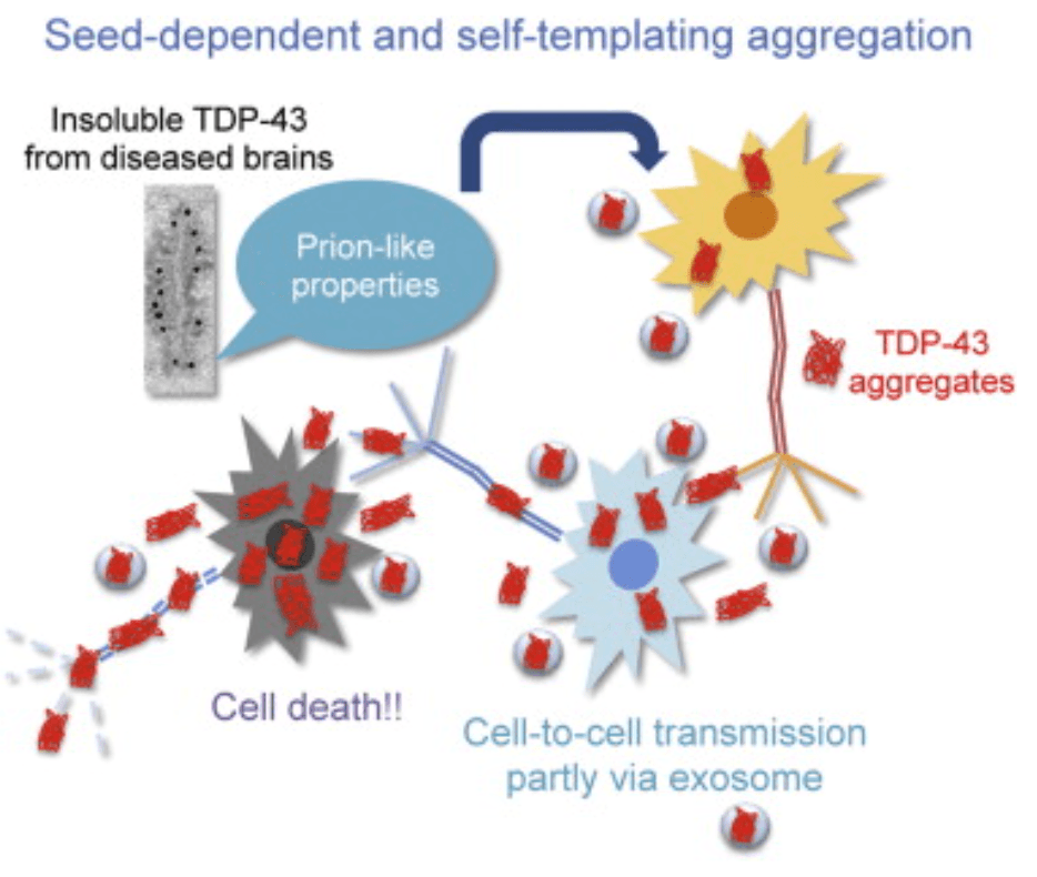 Although TDP-43 is primarily localized to the nucleus, research suggests that TDP-43 in ALS mislocalizes to the cytoplasm and induces misfolding in other proteins due to its prion-like qualities. Evidence for prion-like propagation includes immunoblot analyses that found that C-terminal fragments of the TDP-43 acted as seeds that induced conformational changes across neural systems, and can help explain the progressive nature of ALS (Nonaka 2013). However, while misfolded TDP-43 does travel between cells through exosomes, microvesicles, or other extracellular vesicles similar to other prion diseases, TDP-43 proteinopathies are restricted to spreading within a single host, lacking the infectivity that characterizes the cross-host transmissibility of most prion diseases (Pongrácová 2024).